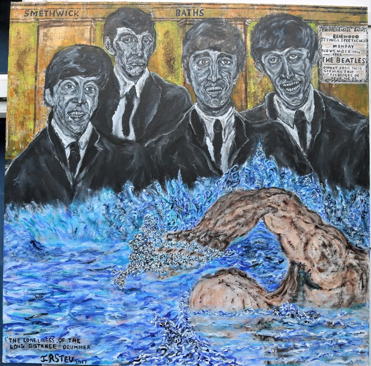 The famous Beatles performed at the Smethick Thimblemill Baths, back in 1962:- just as they were achieving widespread fame. A member of my family was in the audience that night. I regularly swim at the pool and often look up to the stage area whilst swimming.... thinking of all the famous 60's groups that performed there. The Smethwick Baths is a great multiuse Environment catering over the decades since 1930's for swimming, Ballroom Dancing and Concert uses engaging with the community across diverse recreation activities, to provide an inclusive environment responding to change and needs overtime. It is a listed building which has stood the test of time. The Swimmer in the picture is me . I have swam here for over 50 years Man and Boy. This painting was Exhibited At the OUTSIDEIN Environments exhibition has been selected for The 2019 National Outside In Environments exhibition at the Piano Nobile Gallery at Kings Place London 28th October to January .It was also Showcased in FAD magazine publicity article for show